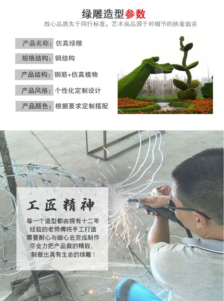 立體花壇采用仿真植物材料,制作出各種造型的仿真綠雕,周圍搭配花草盆栽的使用,設計制作出具有觀賞性的立體花壇。仿真綠雕造假成本相對于真植物綠雕的成本要低,成品方便移動,同時能夠起到綠化周圍環境的效果,使用壽命長,減少人工維護的成本。